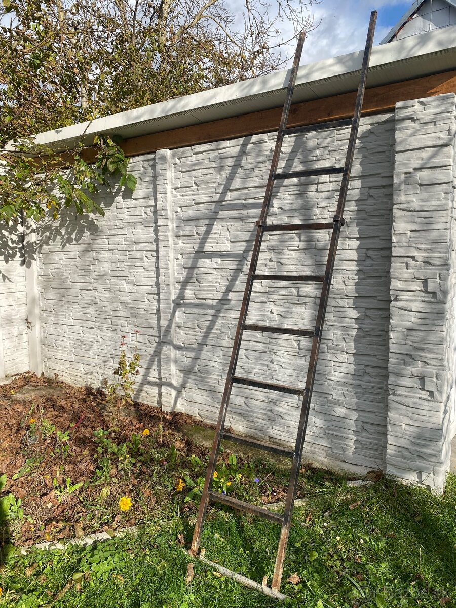 Predam zelezny rebrik zvareny z jaklovych profilov 30x30x2mm s rozsirujucim stabilizacnym podstavcom. Celkova vyska 332cm, vyska najvyssieho schodu 250cm, sirka 51cm. Hmotnost cca 20kg.