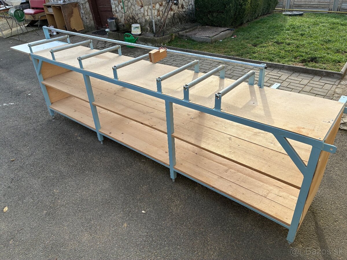 Pevný pracovný stôl s oceľovou konštrukciou a drevenými policami.