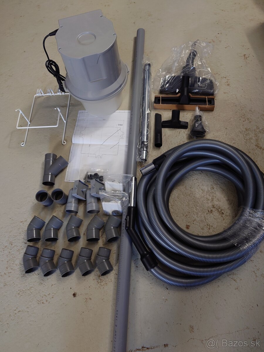 Sada obsahuje centrálnu jednotku, štandardnú hadicu 7,5 metra s komplet príslušenstvom, ďalej sada obsahuje montážne príslušenstvo (koleno, rozbočka, podzásuvka, zásuvka, spojka a PVC-u rúra) presne tak ako je to na fotke.
