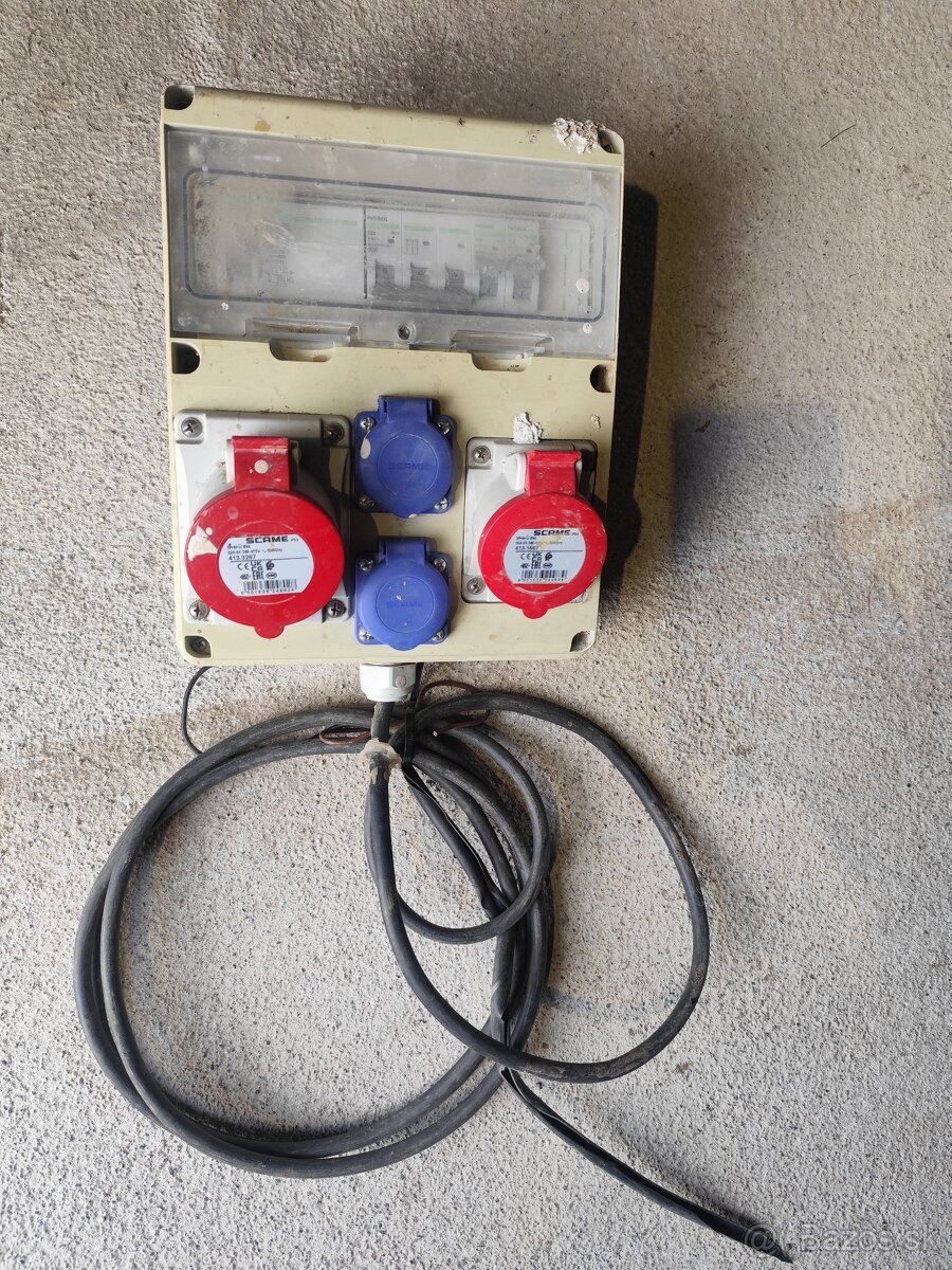 Predám prenosnú rozvodnú skrinku s ističmi, dvoma 400V a dvoma 230V zásuvkami. Skrinka má priehľadný kryt a ističe sú funkčné. Vhodné na stavbu, dielňu alebo záhradu.