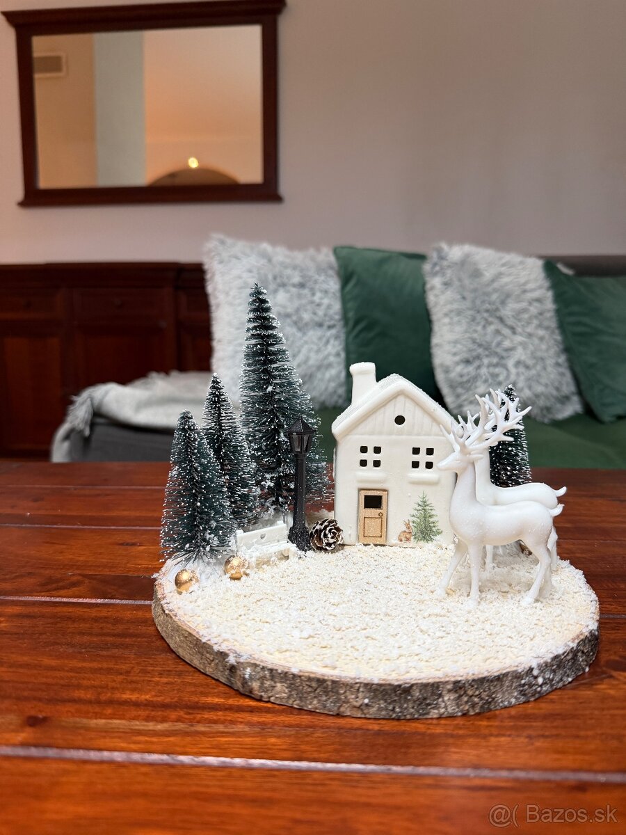 Zimná dekorácia s domčekom, stromčekmi, sánkami a dvoma jeleňmi.