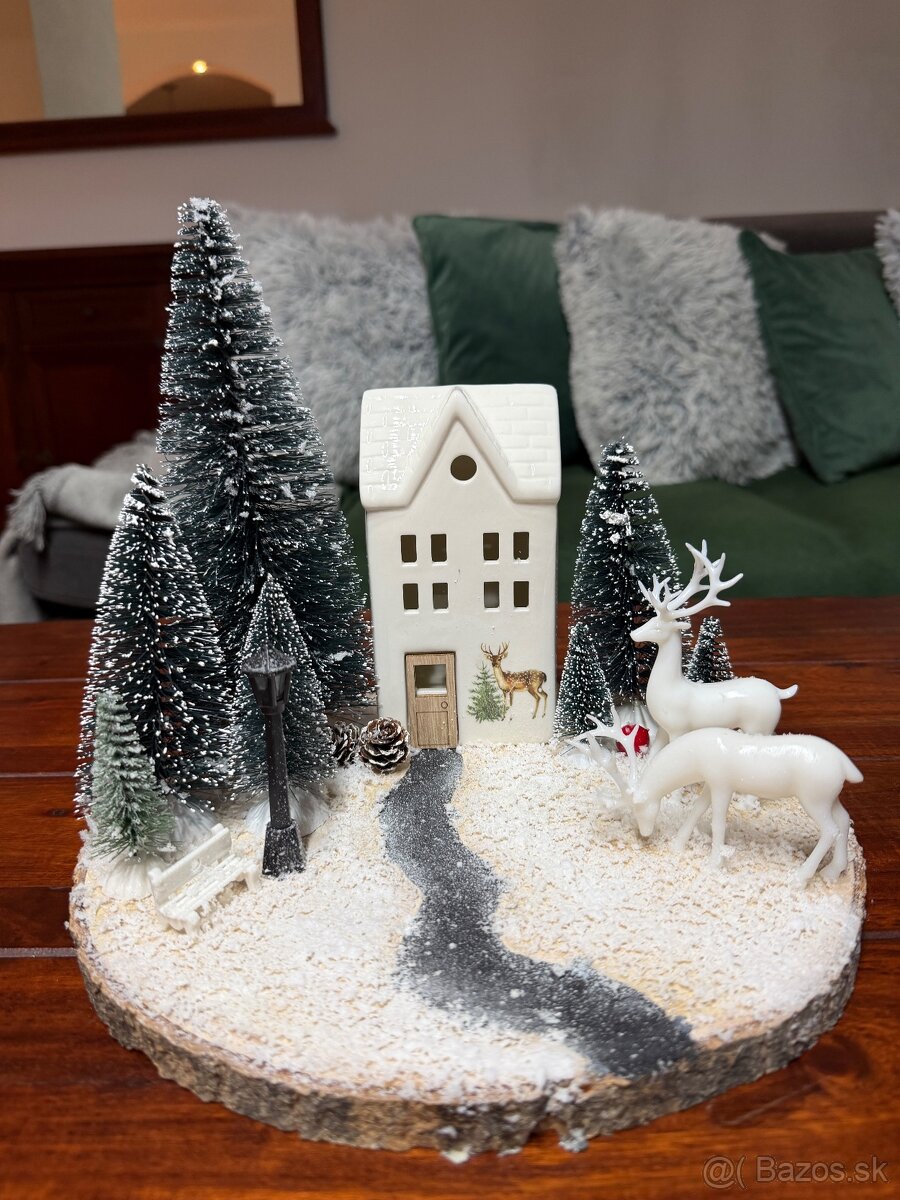 Zimná dekorácia s domčekom, stromčekmi, sánkami a dvoma jeleňmi.