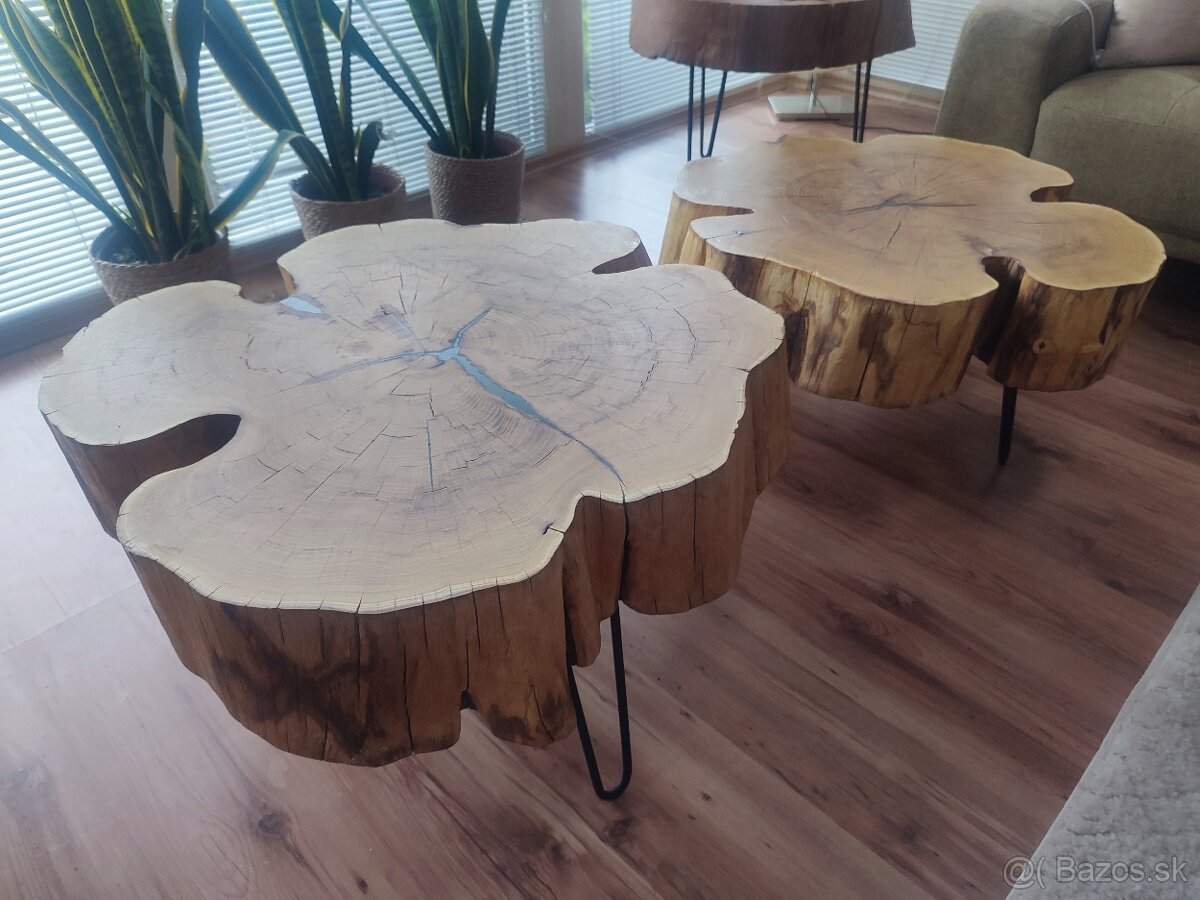 Dva masívne stolíky z 85 ročného AGÁTU, hrúbka 15 cm, výška 40cm resp.45 cm ( inú výšku viem upraviť montážou dlhších resp. kratších nôh) ,priemer cca 75 CM, špáry vyplnené epoxidom, povrchová úprava voskový olej mat . Cena nižšieho (40) =170€, vyššieho (45) =180€. Cena spolu pri kúpe oboch 320€