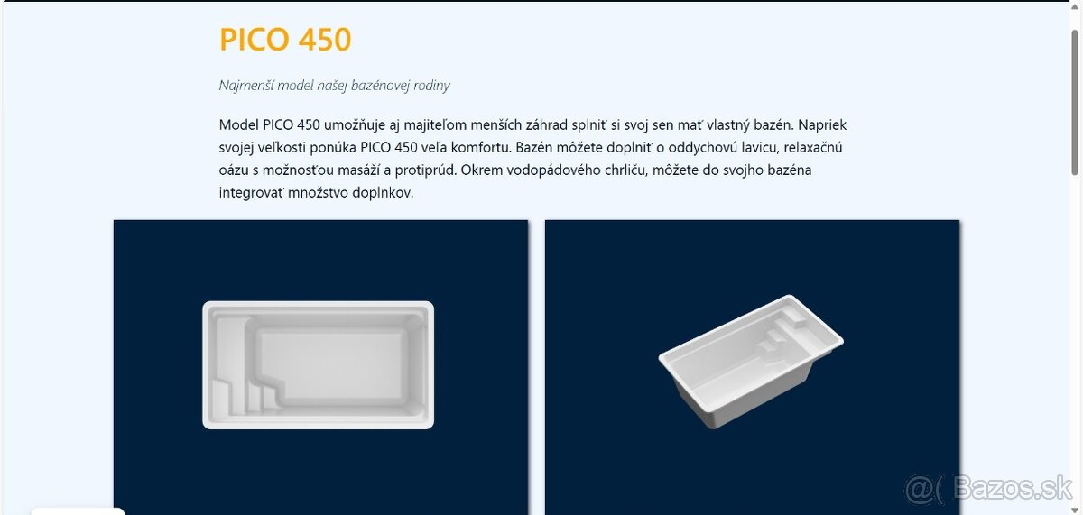 Model PICO 450 umožňuje aj majiteľom menších záhrad splniť si svoj sen mať vlastný bazén. Napriek svojej veľkosti ponúka PICO 450 veľa komfortu. Bazén môžete doplniť o oddychovú lavicu, relaxačnú oázu s možnosťou masáží a protiprúd. Okrem vodopádového chrliču, môžete do svojho bazéna integrovať množstvo doplnkov.