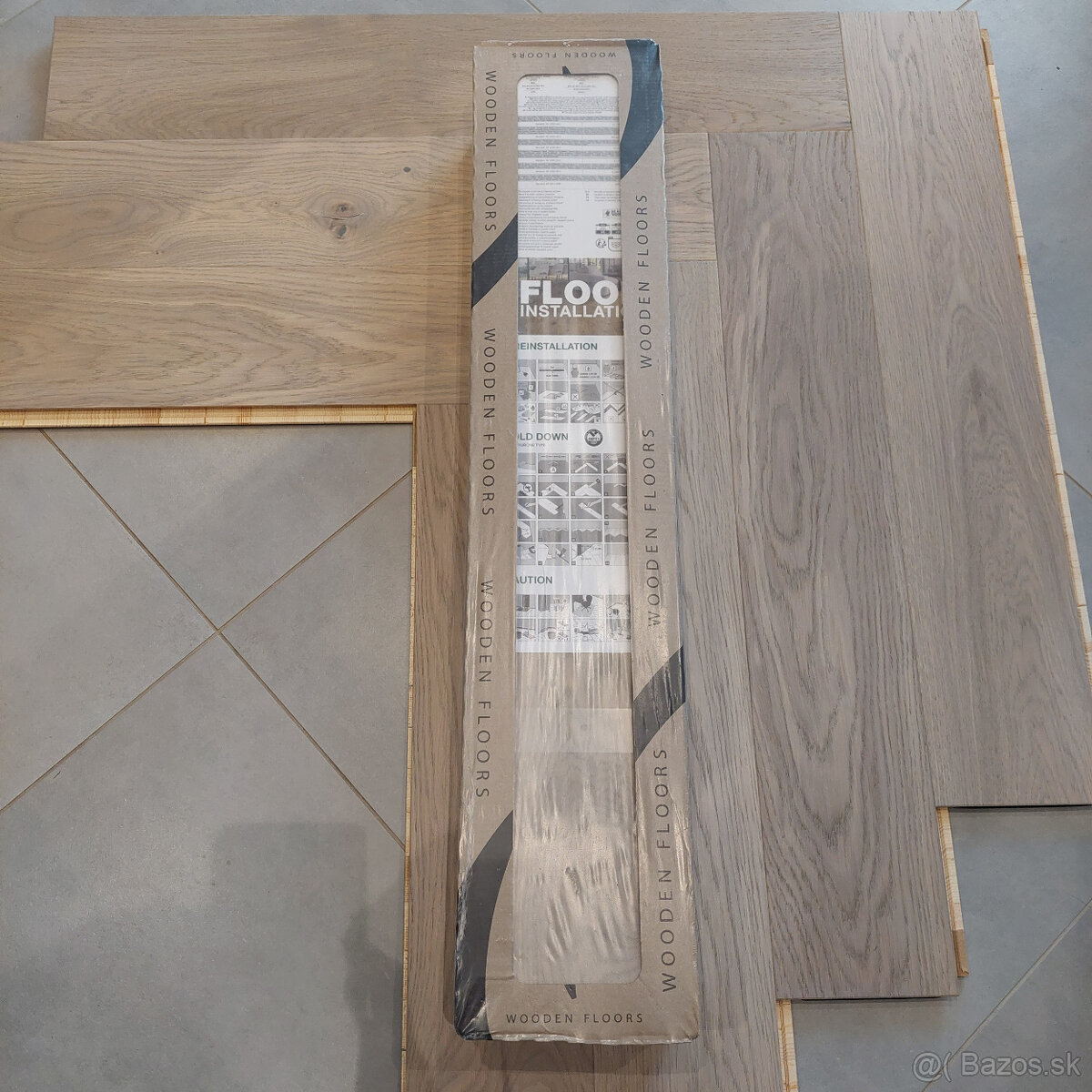 Na predaj drevené trojvrstvové parkety Barlinek Dub Marzipan Muffin Herringbone 130, rozmer lamely 14x130x725mm, bal.0,65m2, povrchová úprava matný lak, kartáč, 4V drážka, pomerne čisté triedenie s malým množstvom hrčí.