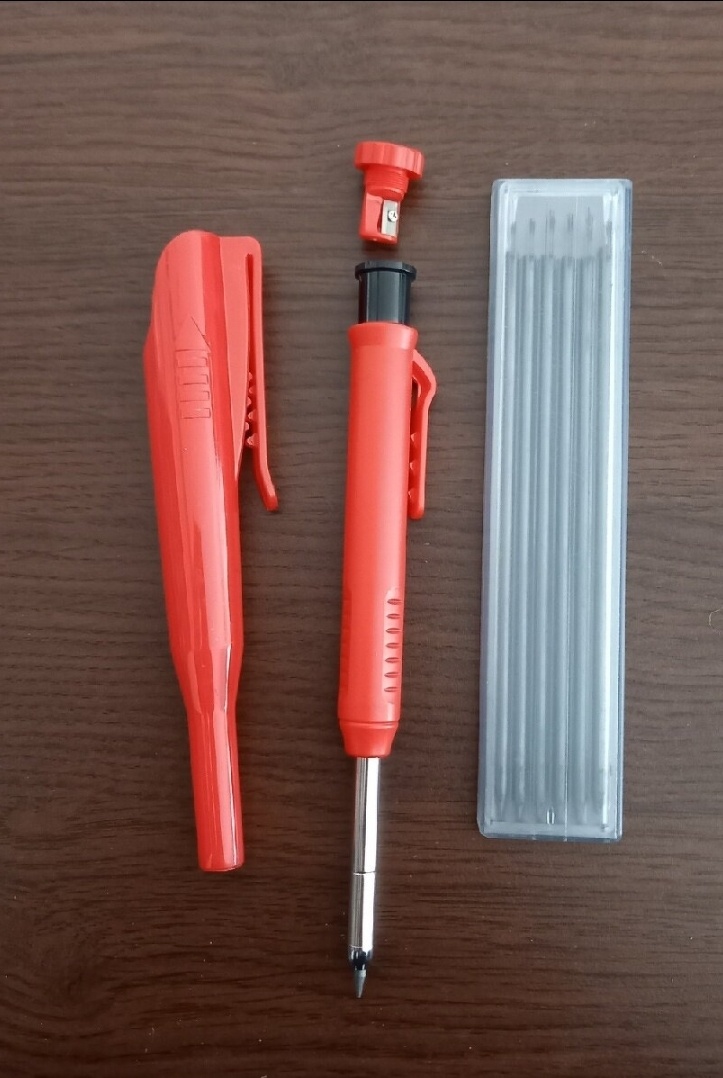 Predám tesársku/murársku/stavbársku ceruzku, obsahuje aj strúhadlo, použitie na rôzne materiály, žltá tuha na kov, červená na stavebné materiály,