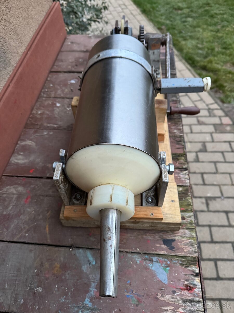 predám plne funkčnú plničku klobás a jaterníc. objem valca je 7 litrov.Systém zasúvania piestu je na hrebeňovom závite. Piest je opatrený tesiacou gumičkou. Sú k tomu tri nástavce. Ložiská sú mazatelné.