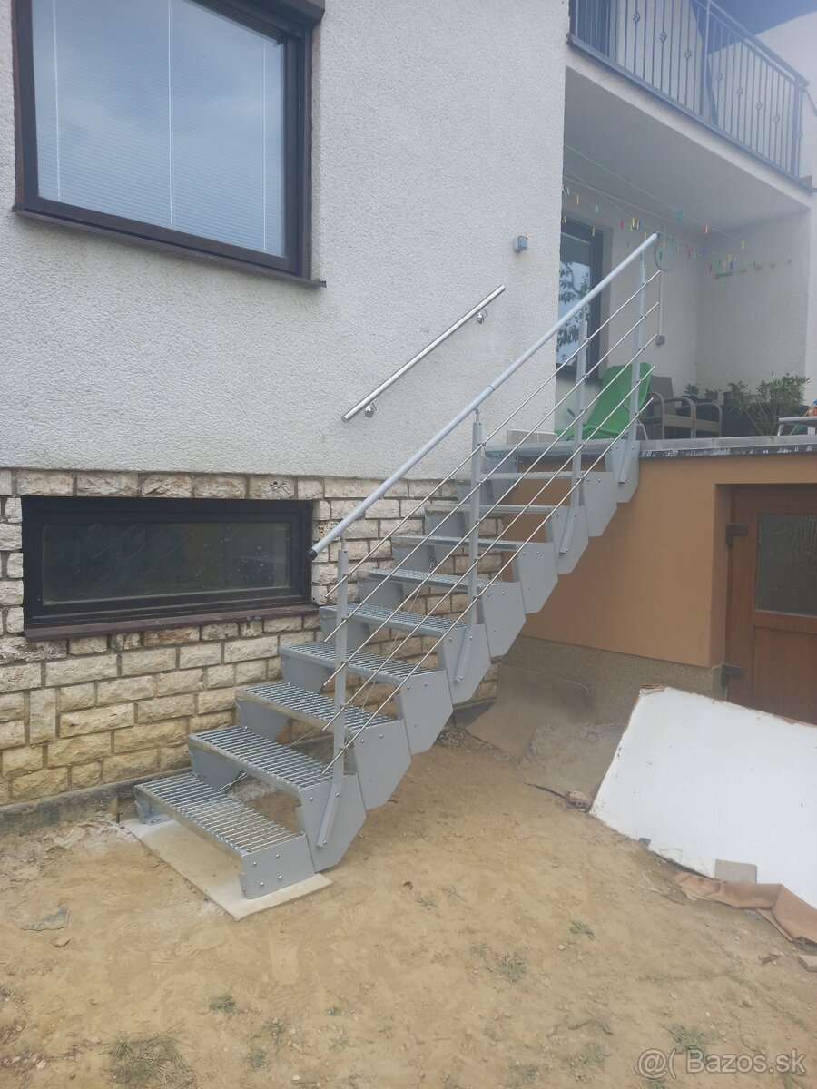Predám vonkajšie kovové schody, šírka stupnice 90 cm x hlbka 25 cm, nastaviteľná výška od 17 do 20 cm. Zostava 10 stupňov je pre výšku od 170 do 200 cm, resp. 220 cm s výšľapom. Stupnice z pozinkovaných roštov, zábradlie z kombinovaných stĺpikov a nerezových priečnkov (5 rád), kovové madlo.