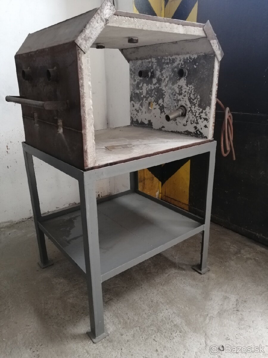 Vyhňa ohrievaná plynom P. B., otvory na plynove horaky sú po oboch stranách a dva otvory su na vrchu vyhňe. Vyhňa je zo žiaruvzdorného betónu a vnútorné rozmery sú šxhxv 700x700x500 mm, celková výška s podstavcom je 1450 mm, bola velmi málo používaná na jeden horák. Cena je 300 €, okr. Senica, 0905 563 302
