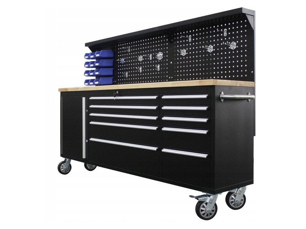 Pracovný stôl do dielne, materiál: oceľ, drevo, šírka: 213 cm, výška: 148 cm, hĺbka: 52 cm, farba: čierna, hrúbka dosky stola: 3,8 cm