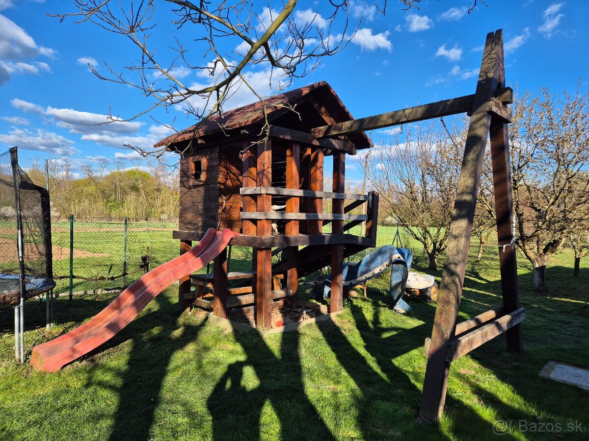 Predám detský domček so šmýkačkou a hrazdou pre hojdačku. Pod domčekom je pieskovisko a lavička + stôl. Dá sa rozobrať po častiach. Potrebná oprava schodov. V cene sú aj horolezecké kamene + trampolína grátis.