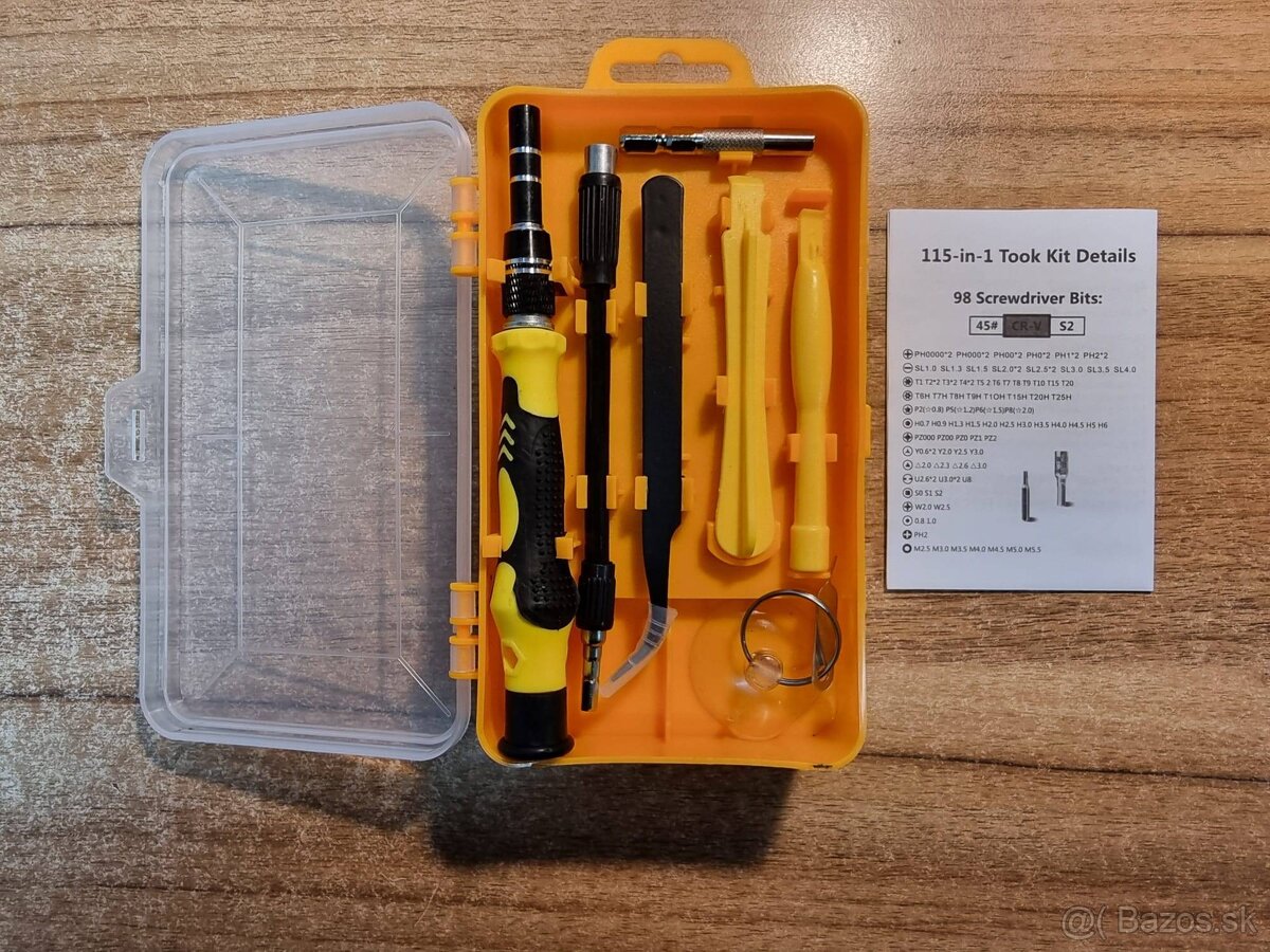 Tento profesionálny set náradia 115v1 je vhodný pre servis mobilov, hodiniek a rôznej inej elektroniky vďaka ohromnému počtu rôznych nadstavcov v jednom balení o rozmere 15,8 x 9,3 x 5,3cm.