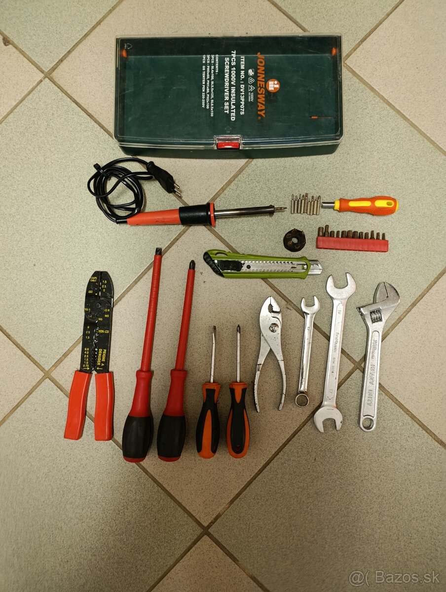 Odizolovacie a lisovacie kliešte.Elektrikárske skrutkovače do 1000V : 1.6x8x175; PH3x150 . Skrutkovač plochý 5x75, križový . Nastaviteľné kombinované kliešte. Vidlicový kľuč č13 , vidlicový kľuč č 17/19. Nastaviteľný kľuč 200mm/8".Odlamovací nôž . Spajkovačka.Sada bitov.Mikroskrutkovač.