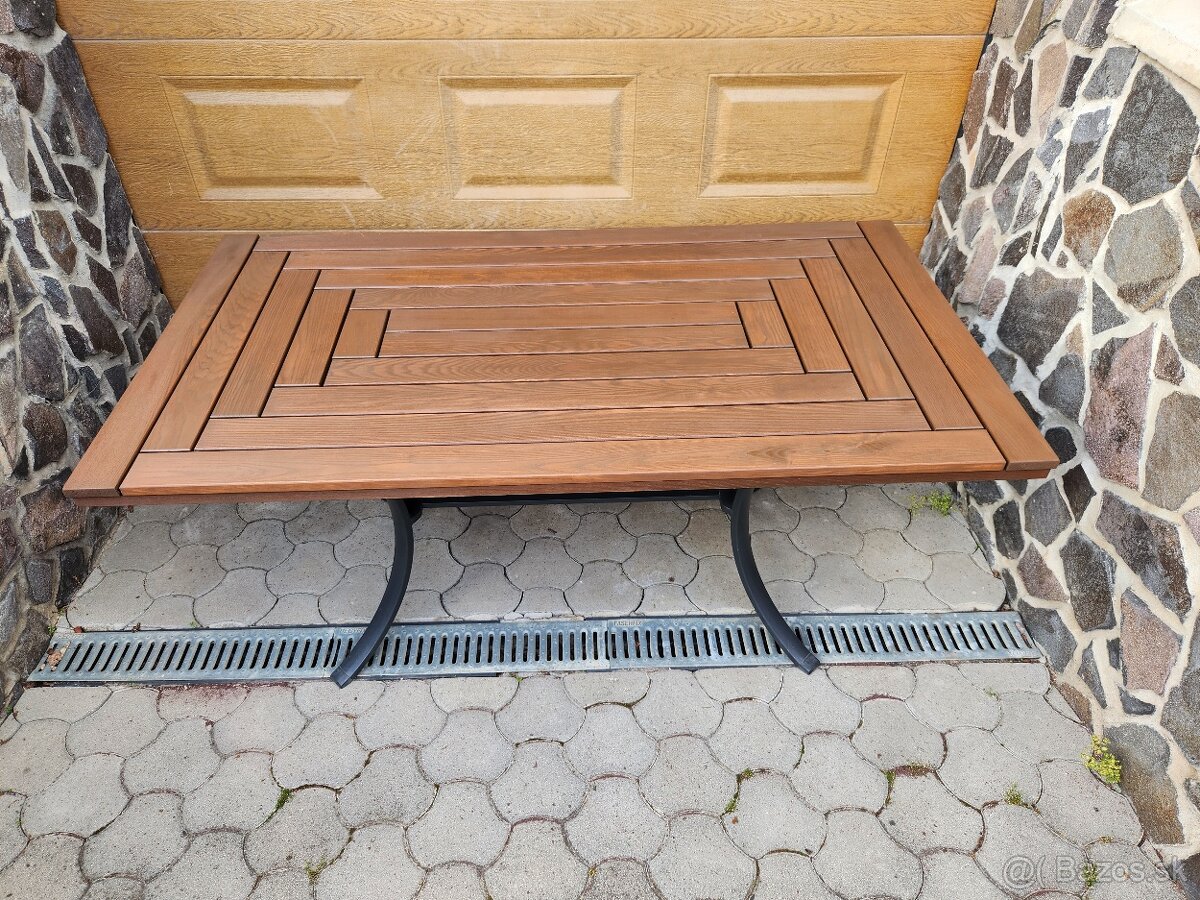 Stôl má pevnú kovovú konštrukciu s elegantnými zakrivenými nohami a drevenú dosku v prírodnom odtieni s moderným vzorom z dosiek rôznych veľkostí. Je ideálny na záhradu, terasu alebo do exteriérových priestorov.