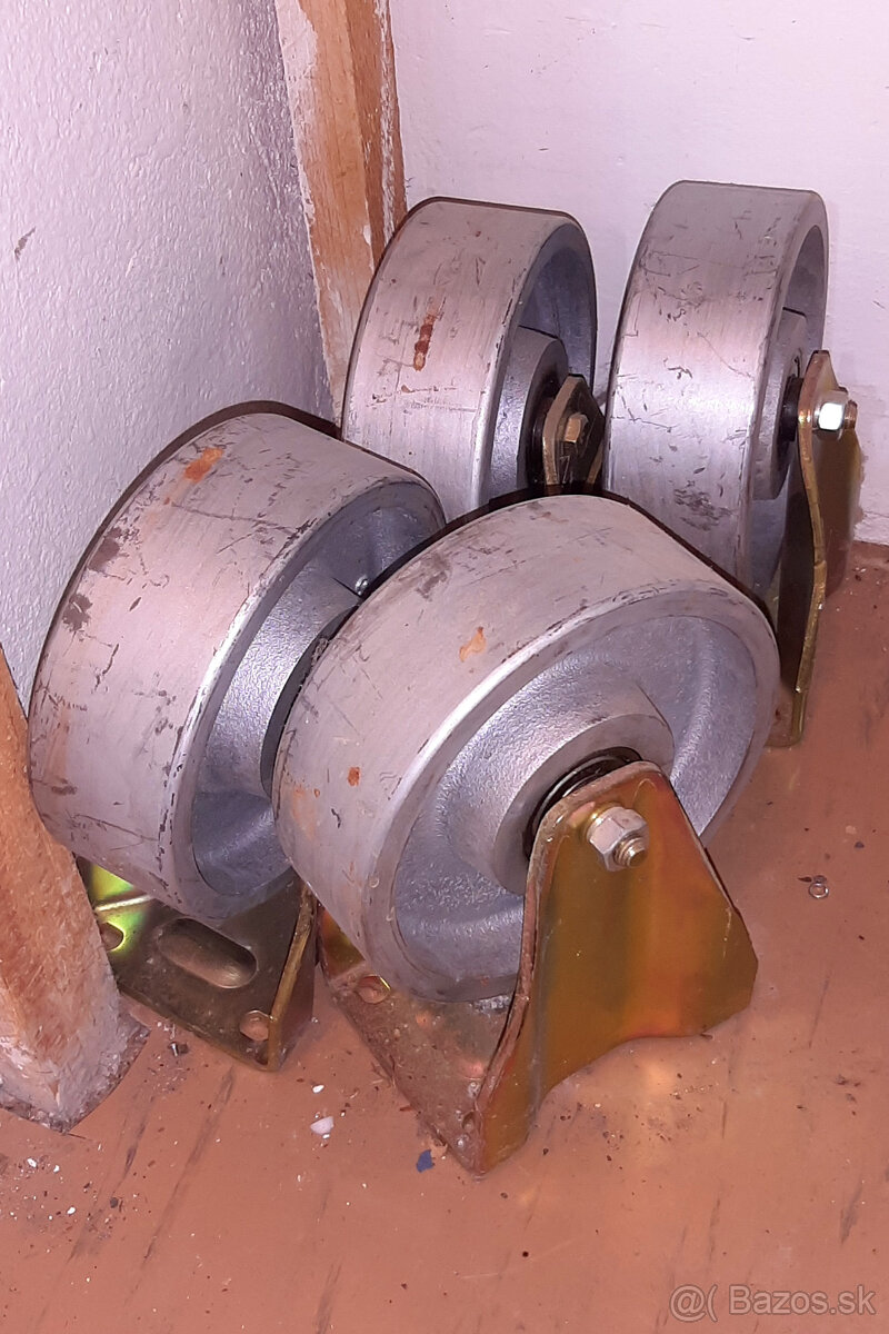Predám nepoužívanú sadu štyroch liatinových kolies na pevnej vidlici. Rozmer kolesa je 180x60. Hmotnosť jedného kolesa je 7,8kg. Kolesa sú na ložiskách 2x 6304 Z. Vysoká nosnosť. Predám len všetky štyri spolu. Len osobný odber kvôli váhe.