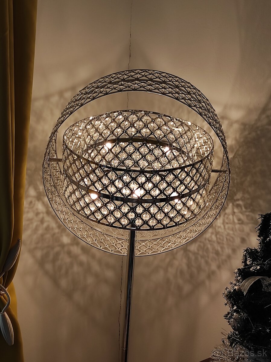 Krásny efekt osvetlenia priestoru, ktorý môže byť zakaždým iný- 3 krištáľové oblúky sú otočné, takže si ju môžete nastaviť do rôznych variácií a mať vždy doma akoby inú lampu s iným svetelnými odrazom v miestnosti. Do lampy môžete dať až 6 žiaroviek, ktore sú osadené na kĺbových otočnych prstencoch, takže viete korigovať aj lúč svetla každej jednej žiarovky individuálne. Poskytuje dostatok svetla na čítanie a zároveň ňou môžete vytvoriť i atmosféru prítmia, stačí použiť menej žiaroviek. Zapnutie a vypnutie pohodlne nohou bez zohýnania. Kábel priesvitný nenápadný. Žiarovky môžete použiť aj úsporné, lúč svetla môžete korigovať smerom hore, dole či do strán v rôznych uhloch. V závislosti od tvaru, ktorý z troch otočnych krištáľových časti vytvoríte, môže mať lampa maximálnu výšku 170 CM a do šírky má 50 CM. Lampa je vo výbornom stave.
