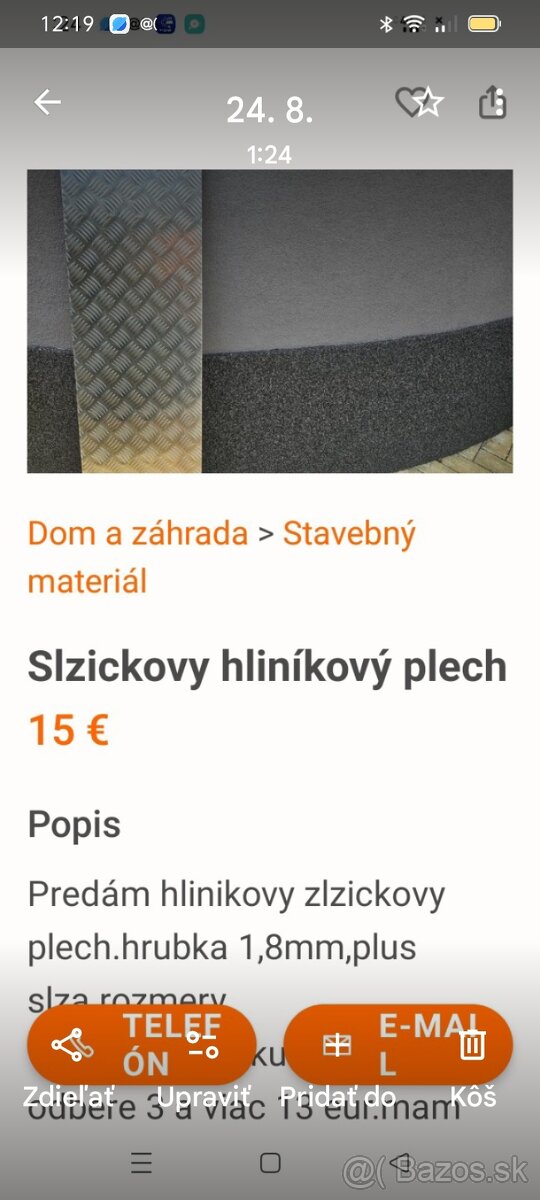 Hliníkový plech,pridané nech sa mi ozve pán ktorý ponúkal na predaj plech viď.foto.tel.0950760132