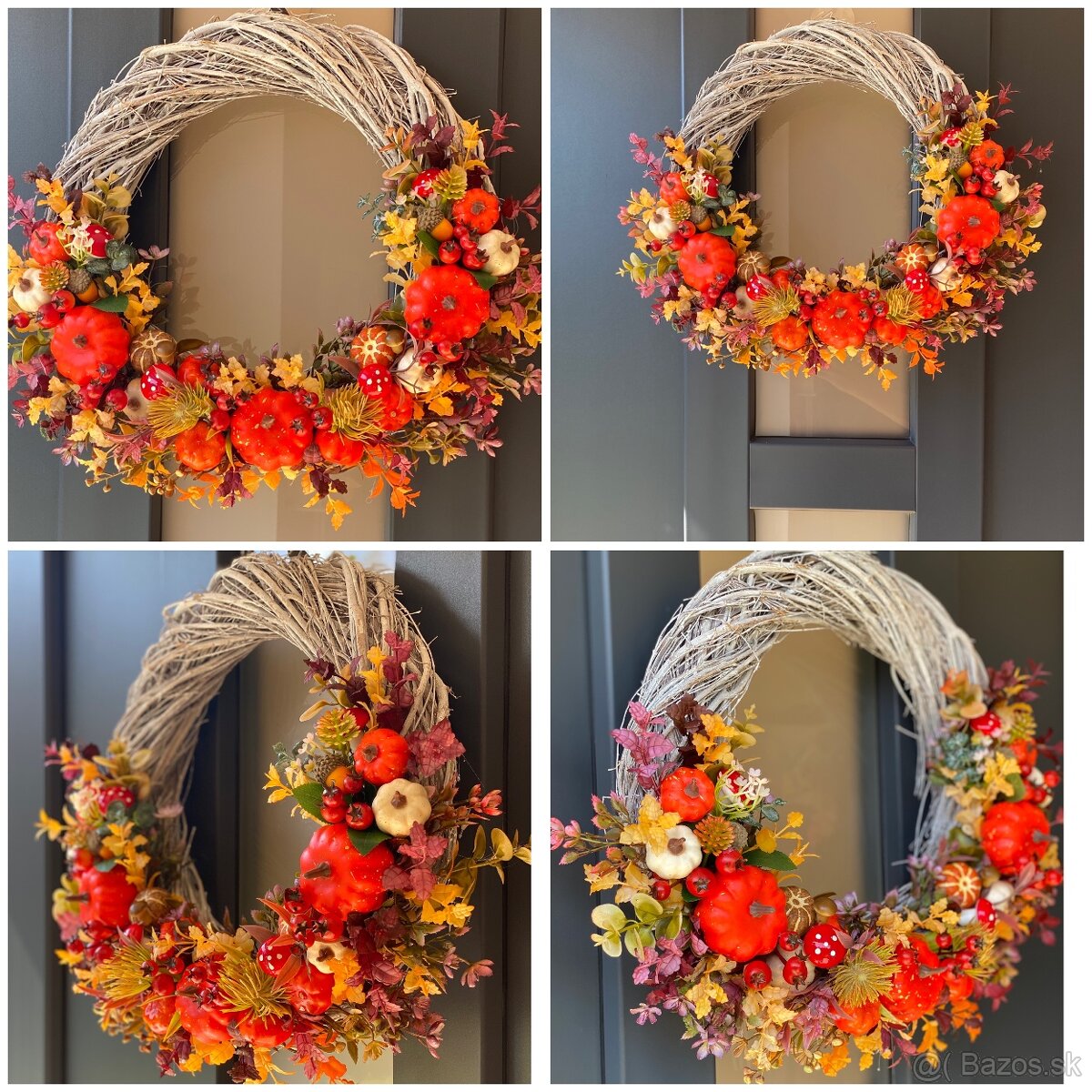 Krásny Jesenný veniec na prútenom sivom základe, kde na spodenej časti venca je zdobený jesennými textilnými kvietkami rôznych farieb, pridané nádherné malé dekorácie ako sú hubičky, jablčka, malé tekvičky, všetko s jemným odtieňom oranžovej farby ktorú jeseň charakterizujú. Veniec vzbudzuje krásny pocit jesenných romantických dni, má ideálnu veľkosť a tým veľmi pekne vynikne zavesený na dverách, v altánku či terase dokonca aj jednoducho na stene v izbách. Priemer je 37-39cm doručenie aj cez packetu dokonca na odberné miesto bez dobierky Uplne zdarma alebo osobne ( zdarma ) v KE
