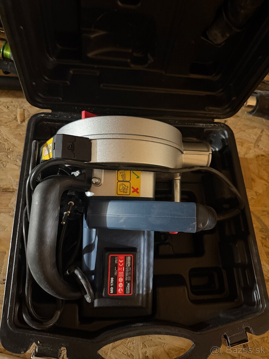 murárska drážkovacia fréza • príkon 1 700 W • 4 000 ot/min • 1,8m kábel • hĺbka rezu 10 až 30 mm • kotúč 150 mm • rezné šírky 2,5/6/14/19/29 • hlučnosť 95 dB • ochranná izolácia • laserové zvýraznenie línie • jednoduché ovládanie • pevne nastaviteľná šírka drážky • vhodná pre tehlu, omietku, sadru apod. • diamantové segmentové kotúče, vylamovacie dláto, vymedzovacie podložky, montážne kľúče a prenosný kufrík v balení.