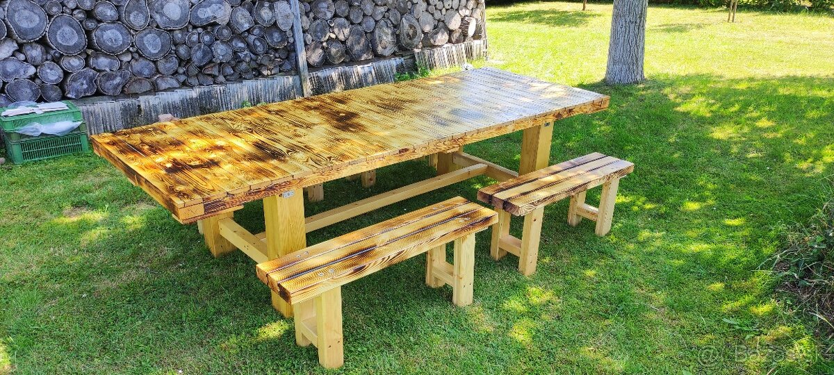 Predám stôl a 4 lavice vyrobené z paliet a hranolov.Sú obrúsené,opálené a napustené fermežou na drevo.Rozmery stola 300x110x80cm,rozmery lavice 120x30x48cm.