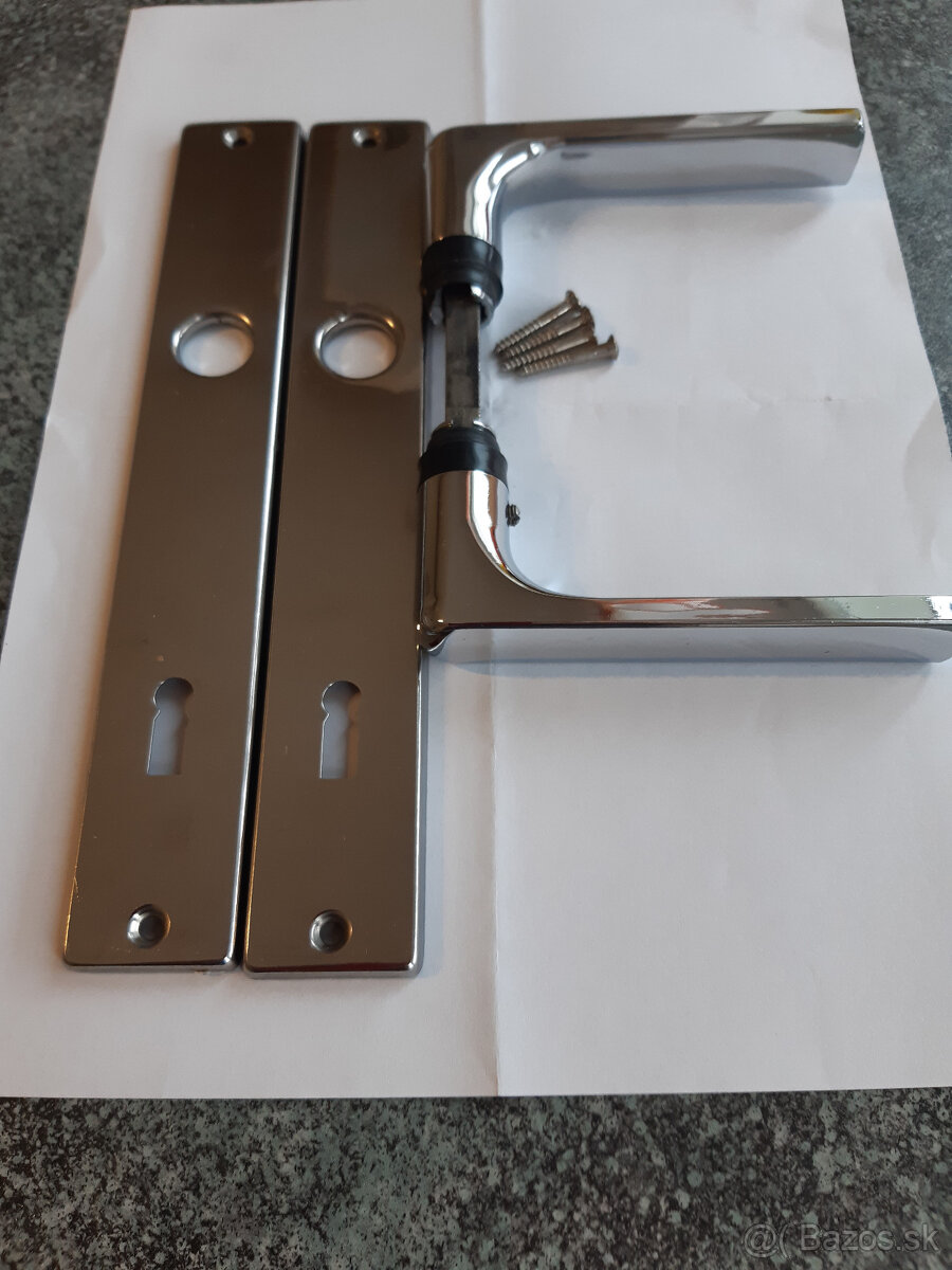 Ponúkam nepoškodené lesklé nerezové kľučky na dvere s roztečou 90 mm, krytka dĺžka 220 mm, šírka 35 mm. Kľučka má dĺžku 110 mm a šírka po spojení kľučiek je 135 mm + 4 skrutky. 8 eur za kus