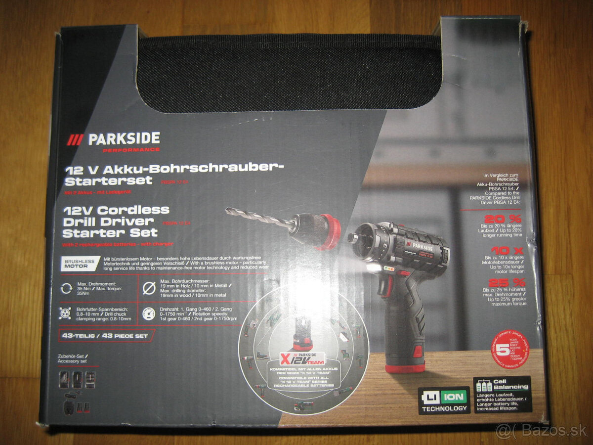 Predám nový aku skrutkovač Parkside Performance, 12 V, max. krútiaci moment 35 Nm, upnutie skľučovadla 0,8 - 10 mm, 1. 0 - 460 ot/min., 2. 0 - 1750 ot/min., 2 x akumulátor, nabíjačka, sada bitov, vrtáky do dreva a kovu.