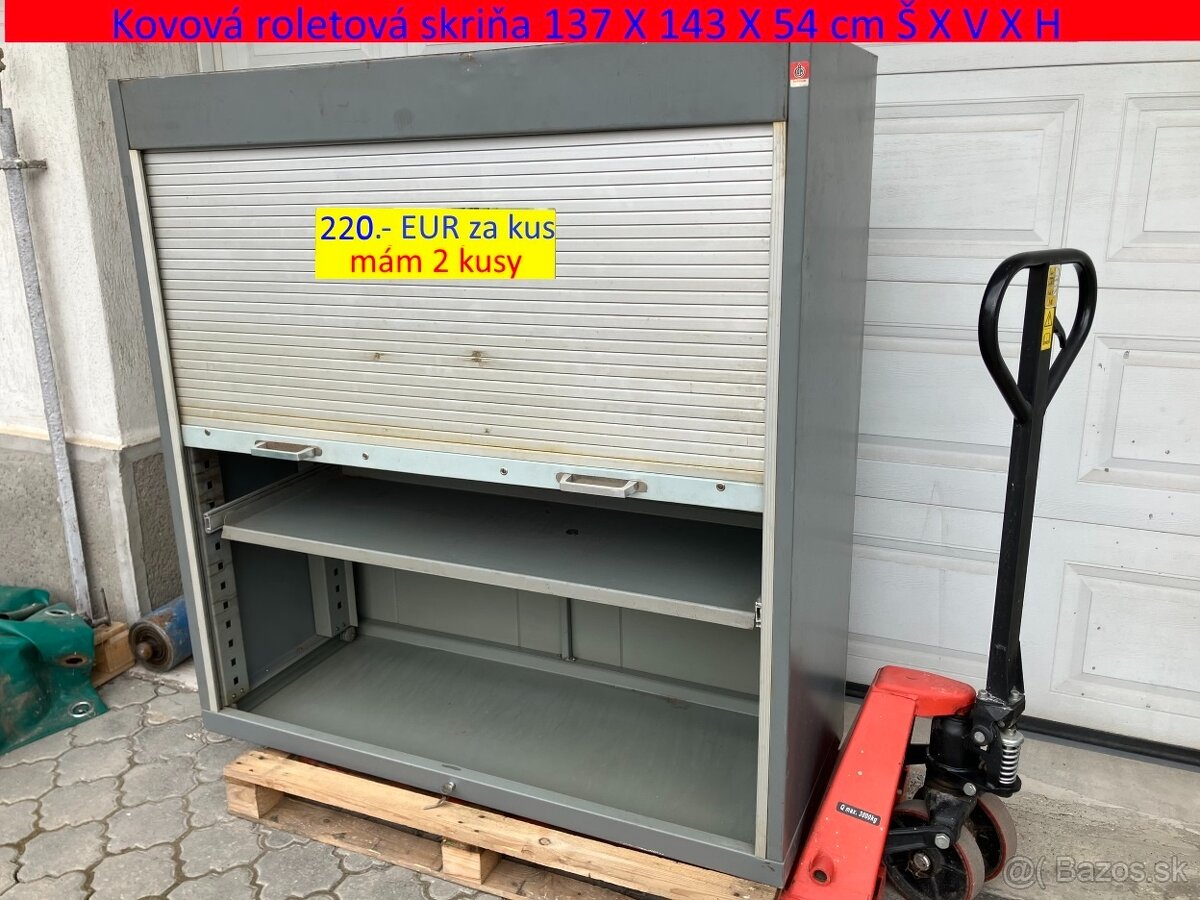 Kovová rolovacia skriňa zachovalá, rozmery: Š X V X H - 137 X 143 X 54 cm, železná konštrukcia a hliníková roleta vyrobená v OPP GALANTA podľa priložených fotografií. Plechová skriňa má 4 police, police sú vysúvacie.