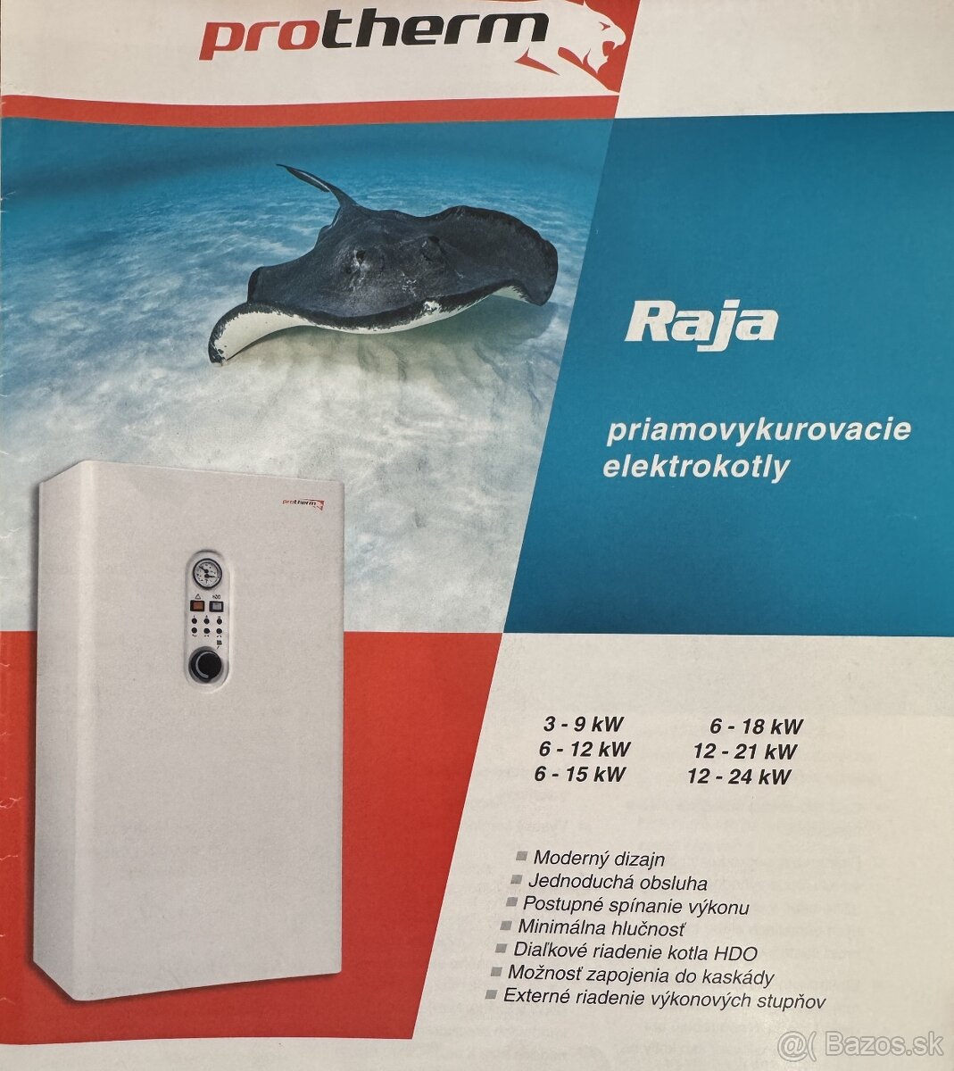 Predám elektrický kotol Protherm RAJA 15 kW a priestorový termostat s rádiovým ovládaním. Kotol má voliteľný maximálny výkon 6-9-12-15 kW, HDO snímač na blokovanie v prípade vysokého tarifu, ohrieva zásobník na teplú vodu aj radiátory alebo podlahový systém cez trojcestný ventil, nastaviteľná teplota vykurovacej vody, integrovaná expanzná nádoba. Kotol je spoľahlivý, bez známok poškodenia, aj keď bol v prevádzke 15 rokov v malom rodinnom dome.