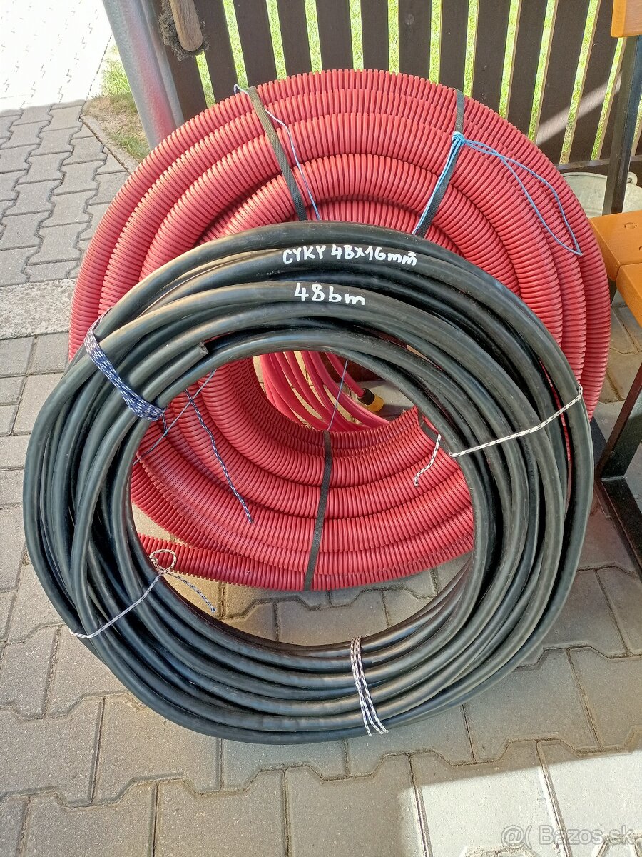 Predám nový elektricý kábel CYKY 4Bx16mm2 - 48m, + novú ochrannú červenú hadicu na kábel - priemer 50mm,- 50m. Len spolu.Vhodný aj do zeme na elektrickú domovú prípojku.