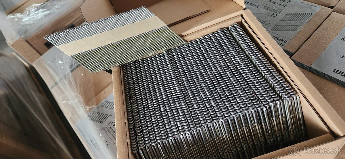 Predam nove klince pod 34 33 stupnovym uhlom spajane v papierovej paske s D typom hlavy. Vhodne do vsetkych konvencnych plynovych klincovacie, akumulatorovych klincovacov ako aj klincovacov na stlaceny vzduch ako su: