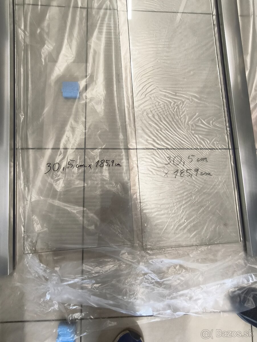 Predám sklenené stienky z kaleného bezpečnostného skla,aj s ukotvovacími stenovými profilmi.Sklo má aj povrchovú úpravu pre lepšie stekanie vody a preto sa menej špiní.Rozmery 185,9cm x 30,5cm.Po namontovaní sa dá sklo v profile povitiahnuť do 32,5cm.Stienky sú dve,ale predám aj po kuse.Cena 40€/ks.Pri odbere oboch viem dať za 60€.Možné použiť aj ako svetlík.
