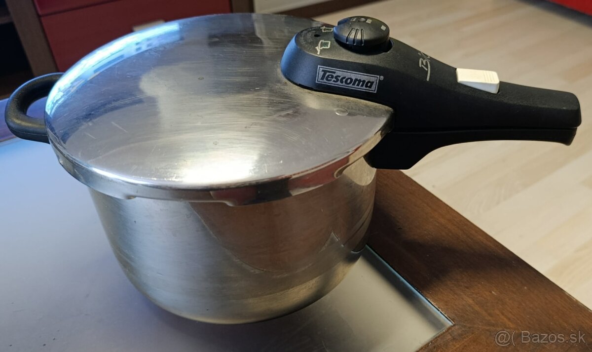 Tlakový hrniec Tescoma 6 L starší model použivaný v dobrom stave cena 35€ stav bez poškodenia bežné známky používania.
