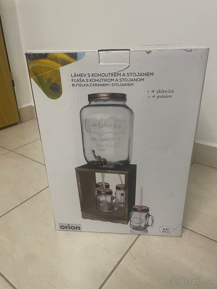 Ide o súpravu nápojovej fľaše s kohútikom, stojana a štyroch pohárov značky Orion.