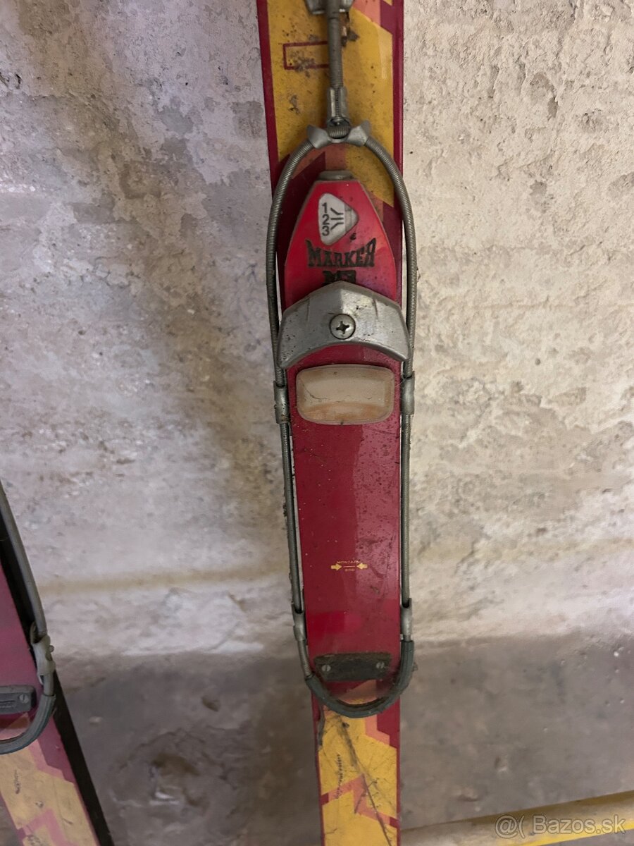 Lyže sú kompletné, s pôvodným viazaním, stav zodpovedá veku – vhodné najmä ako retro dekorácia na chatu, do interiéru, baru alebo Airbnb.