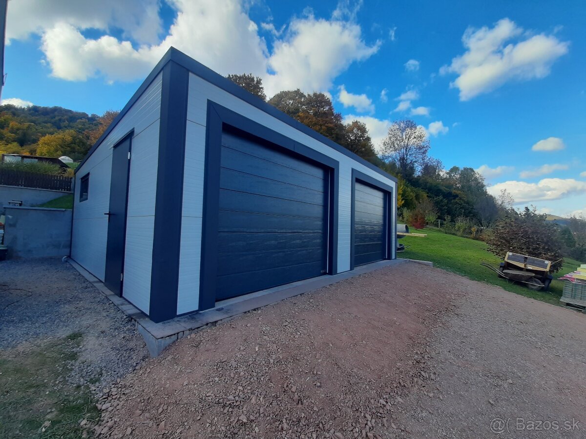 Predám nadštandardnú dvoj garáž ktorá sa skladá z pur panelov a kovovej žiarovo pozinkovanej konštrukcie(čo je najlepšia ochrana proti korózii) o rozmere 6x6m výška v predu 2,5m vzadu 2,2m. Garáž je z 100mm panelov čo sa rovná tepelnej vlastnosti Ytong 30cm zateplený 8cm