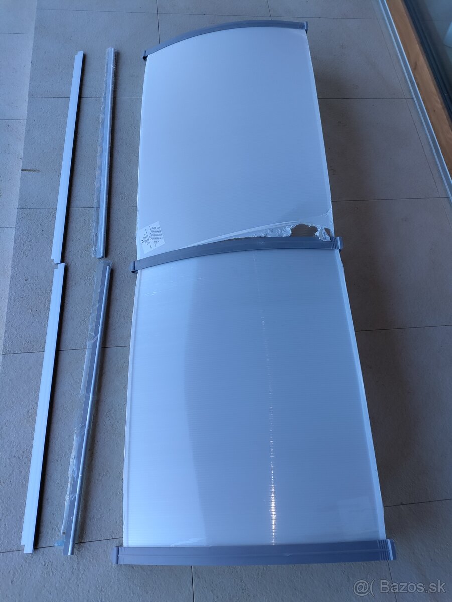 Predam pristresok nad dvere, sklada sa z 2 casti, celkova dlzka 215,6 cm. Jedna cast polykarbonatu je v dlzke cca 11 cm prehnuta, ale nie je problem to zmontovat. Druha cast je prehnuta len jemne. K dispozicci len 1 sada montaznych komponentov, druhu je potrebne dokupit.