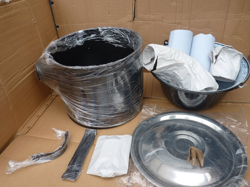 Kompletny smaltovany kotlik a kotlinu s nožičkami, pokrievkou a kominom, 16 litrový na varenie gulašu.