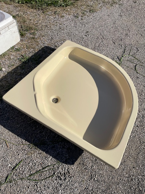 Predám plechovú smaltovanú rohovú sprchovú vaničku, novú, rozmer 90x90cm, cena 80,00Eur.