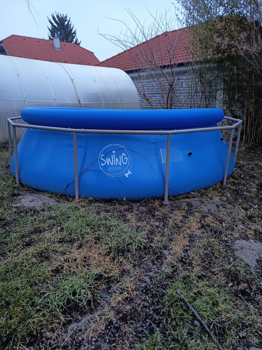 Teleso bazéna,piesková filtracia,hadice,piesok,schodíky,tyč s sitkom a ručným vysávačom,solárna plachta,krycia plachta,plávajúci skiner,teplomer,chemia...2x oranžové lehátko,slnečník...