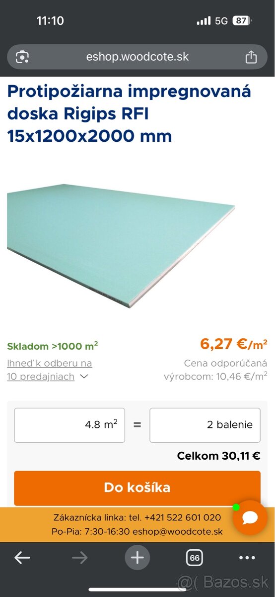Predám Protipožiarna impregnovaná doska Rigips RFI 15x1200x2000 mm