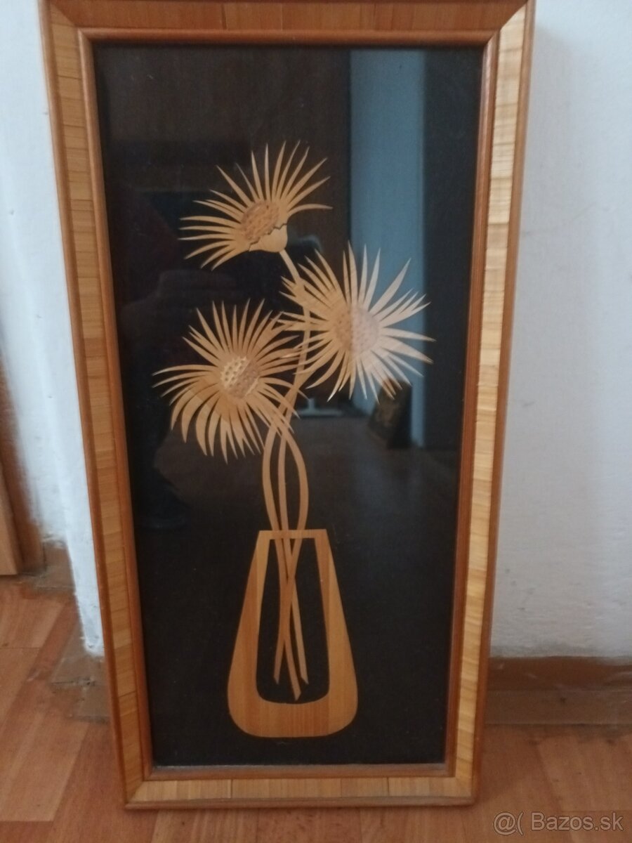Predám obraz zo slamy 47x24cm, drevené obrazy 61x24 a 15x18 a drevenú sochu 33x8cm. Každý po 15€, malý za 10€.