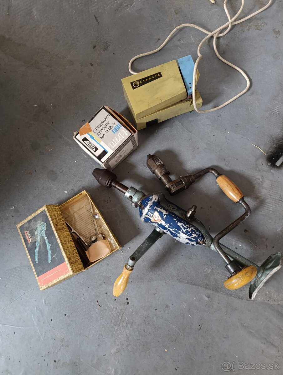 Tieto retro funkčné veci malá cestovná žehlicka jedna nebola nikdy používaná druhá párkrát, elektricka brúska na nožík a ceruzky, ručné vŕtačky