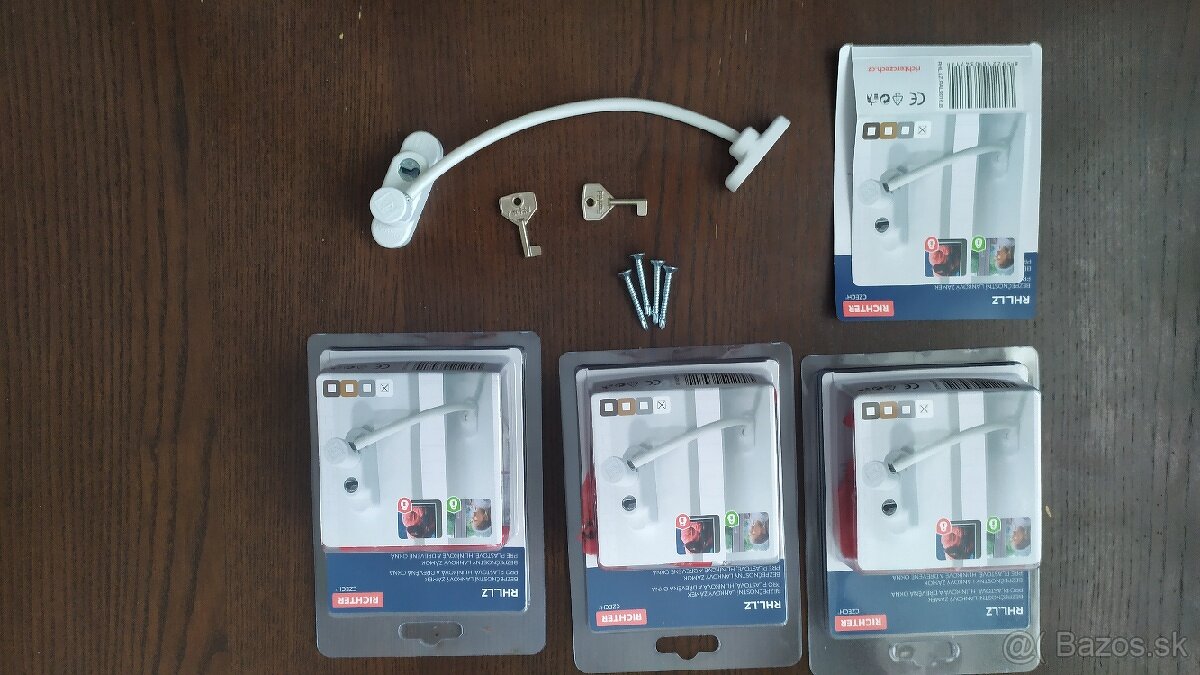 Predám bezpečnostnú poistku pre deti aby nemohli otvorit okno. Ideálne pre okná na vyšších poschodiach v dome alebo činžiaku. Vrátane skrutiek a kľùčov. 4ks. cena za všetky 4