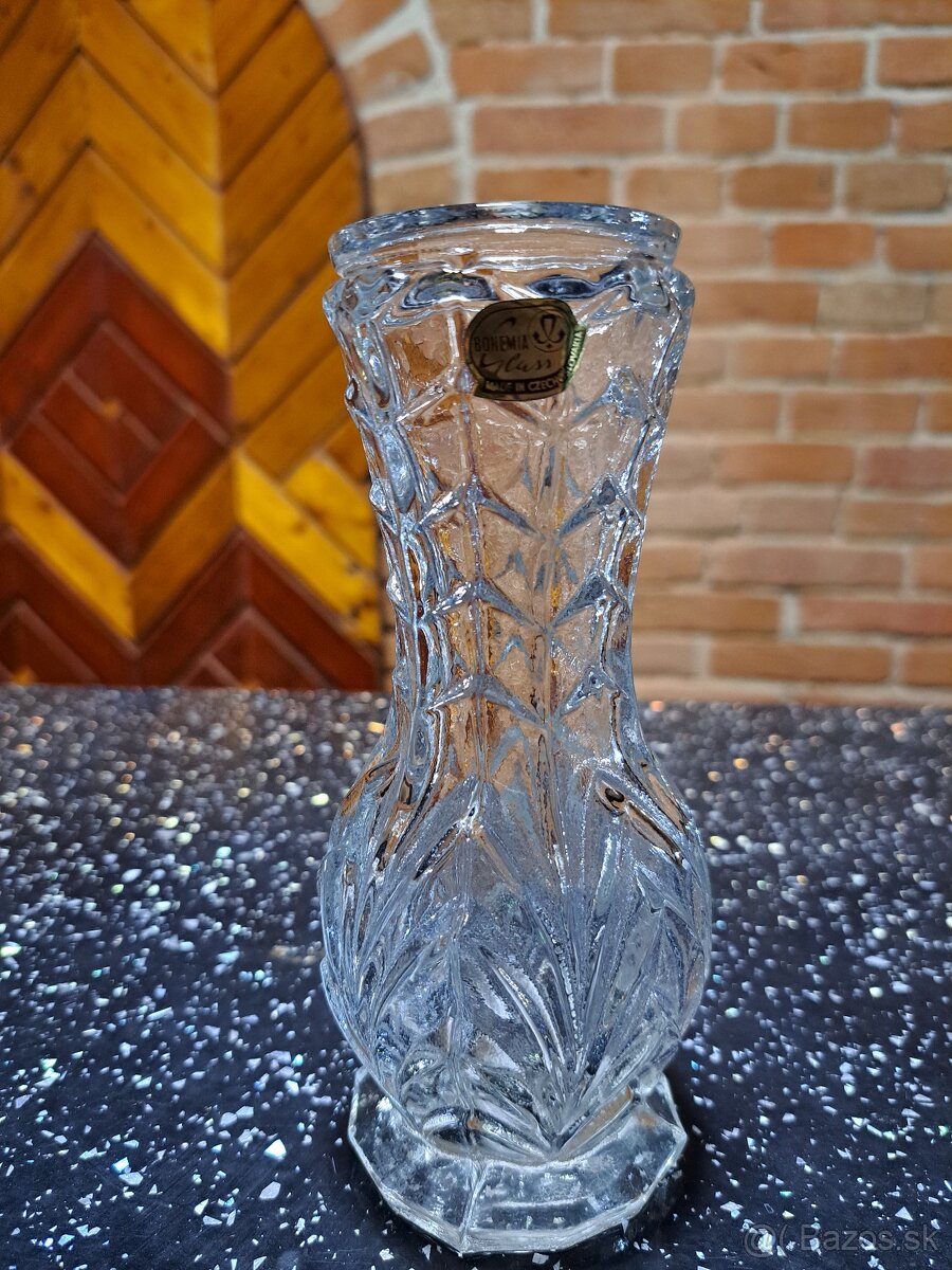 Jeden kus vázy 8 Eur. Krištáľové brúsené sklo od 25 Eur s vázou BOHEMIA.