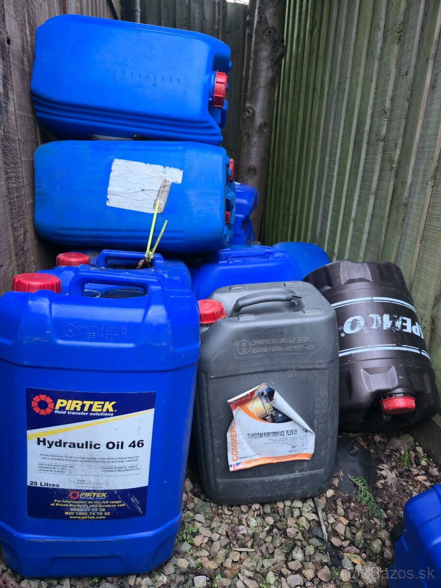 Plastove bandasky o objeme 20 litrov a 25 litrov, povodne od hydraulickeho alebo motoroveho oleja, neskor pouzite na naftu.