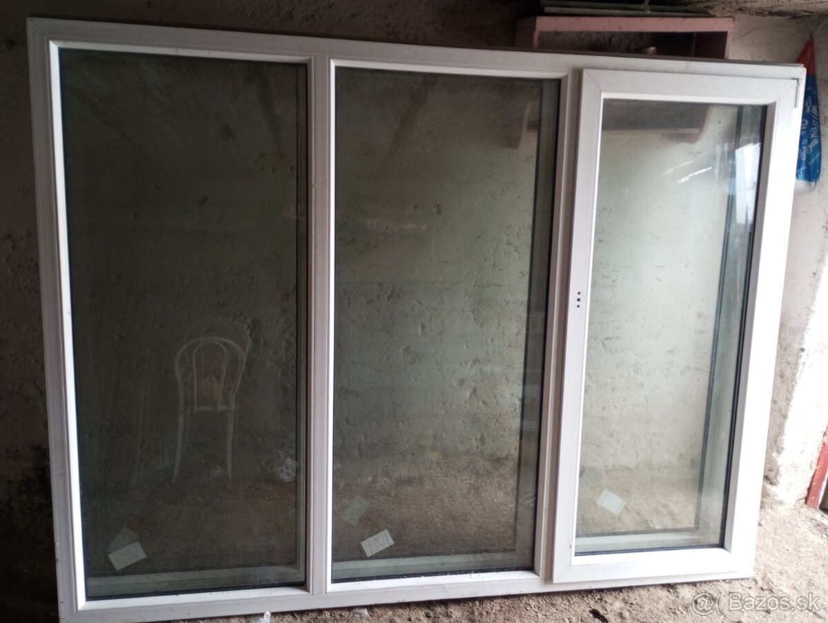 Ponúkam na predaj úplne nové plastové okná o rozmere 2,35 m x 1,80 m.