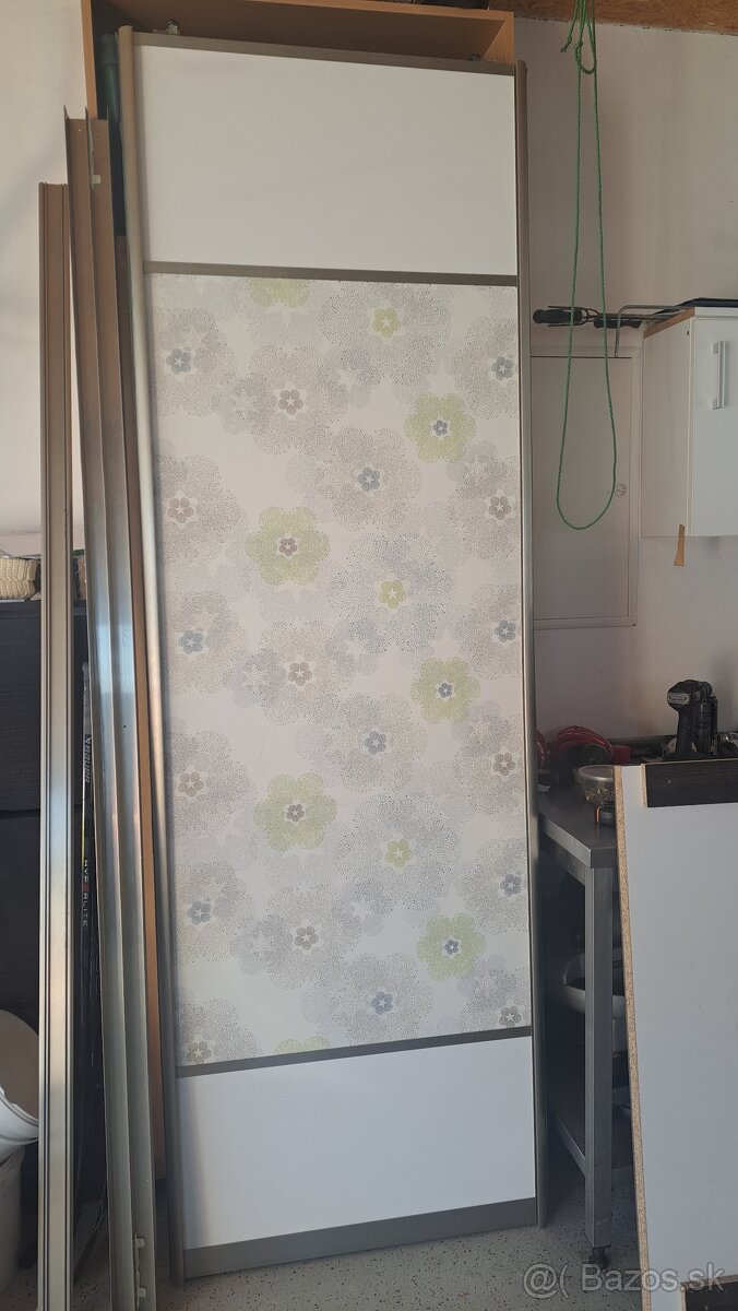 Nepoškodene dvere zo vstavanej skrine (spodna koľajnica a horna vodiaca lista) rozmer 238 x 79 , moznost si upravit. K dispozicii su 3 x dvere, bočné lišty a tapeta su nepoškodené, horne kolieska bude treba vymenit su plastove za kovové.