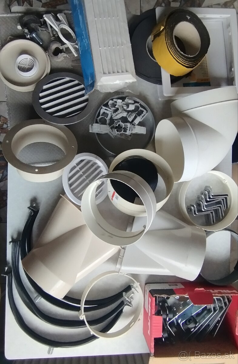 Predám rôzne diely na vzduchotechniku – mriežky, kolená, odbočky, objímky, úchyty, tesniace pásky a drobné kovové komponenty. Predaj len ako celok. Cena 15 €. Osobný odber. Poštou 25 € po úhrade na účet