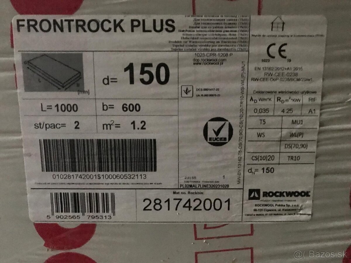 Predám fasádnu tvrdenú minerálnu vatu ROCKWOOL FRONTROCK PLUS, hrúbka 15cm. Cena 15 Eur/m2. Spolu mám tri balíky, takže 3,6m2. Pribalím aj zátky.