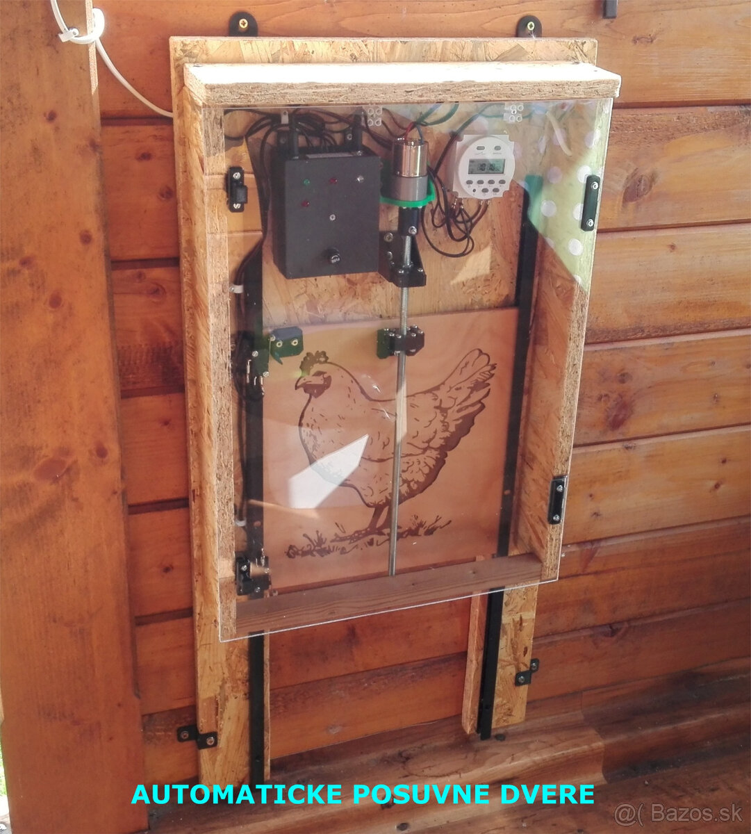 Dalsi z mojich projektov dokonceny. Je to prezentacia automatickeho otvarania a zatvarania dveri kurina. Je to vhodne hlavne tam, kde je kurin vzdialeny od bydliska a nie sme tam kazdy den, napriklad na vzdialenej zahradke a chatke a pod... Mam pripravene dve verzie: 1. verzia ak je moznost siete 230V na kurine, alebo blizko pri kurine (napajaci zdroj AC230v/DC12V-1A) 2. verzia ak nie je moznost siete 230V na kurine, alebo blizko pri kurine (autobateria 12V) Pohon zavitovej skrutky M8 zabezpecuje DC motor 12V-1A s pdrevodovkou a otackami cca 200ot/min. na vystupe. Cas otvarania(rano) a zatvarania(vecer) sa programuje pomocu dig. spinacich hodin napr. (Emos, Solid a pod.). Zhotovim na zakazku... v okoli PB mozem aj nainstalovat, alebo pomoct s instalaciou.